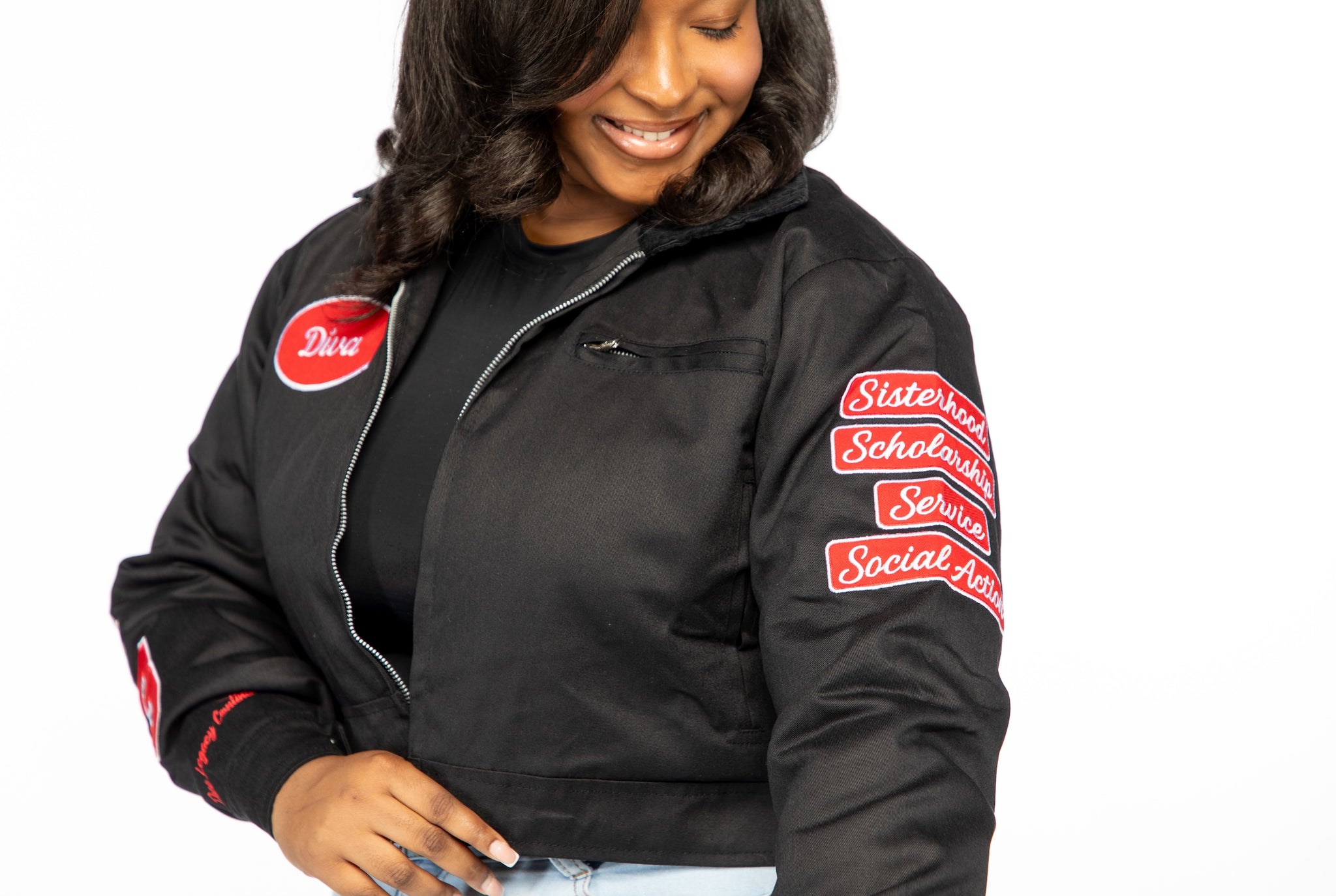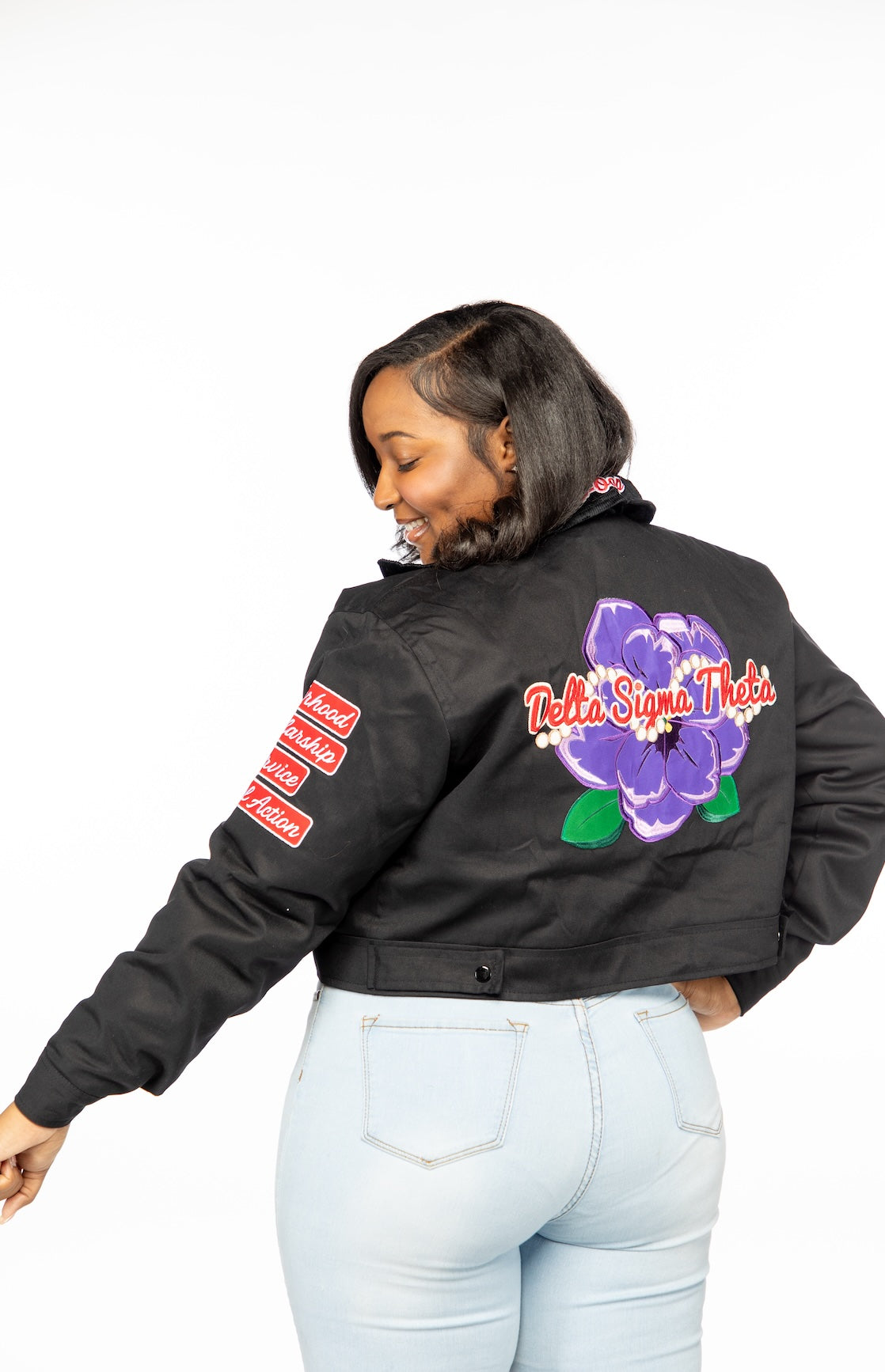 The Jacket is cropped and uses the same size chart as our more than a social club cropped jackets.