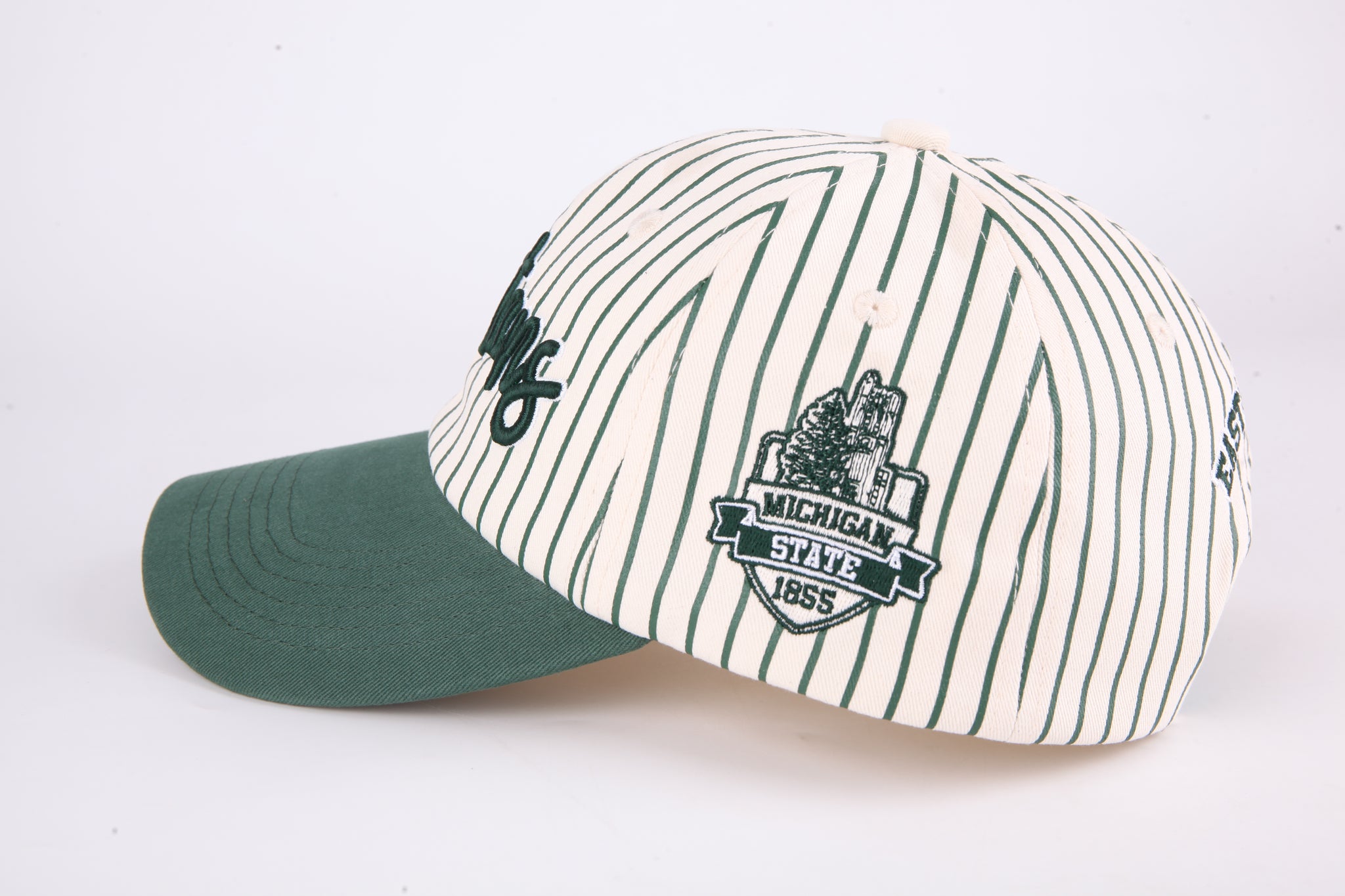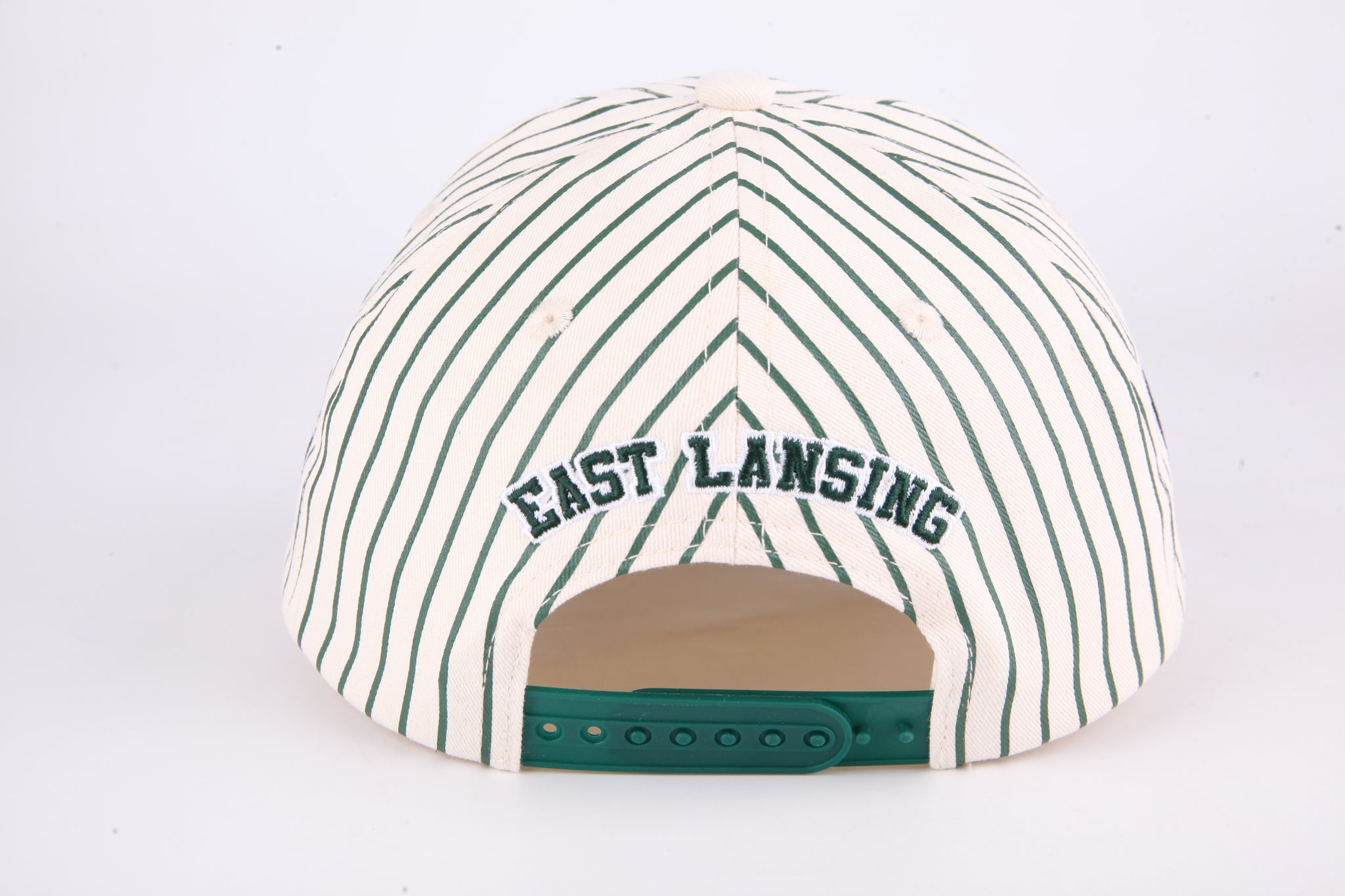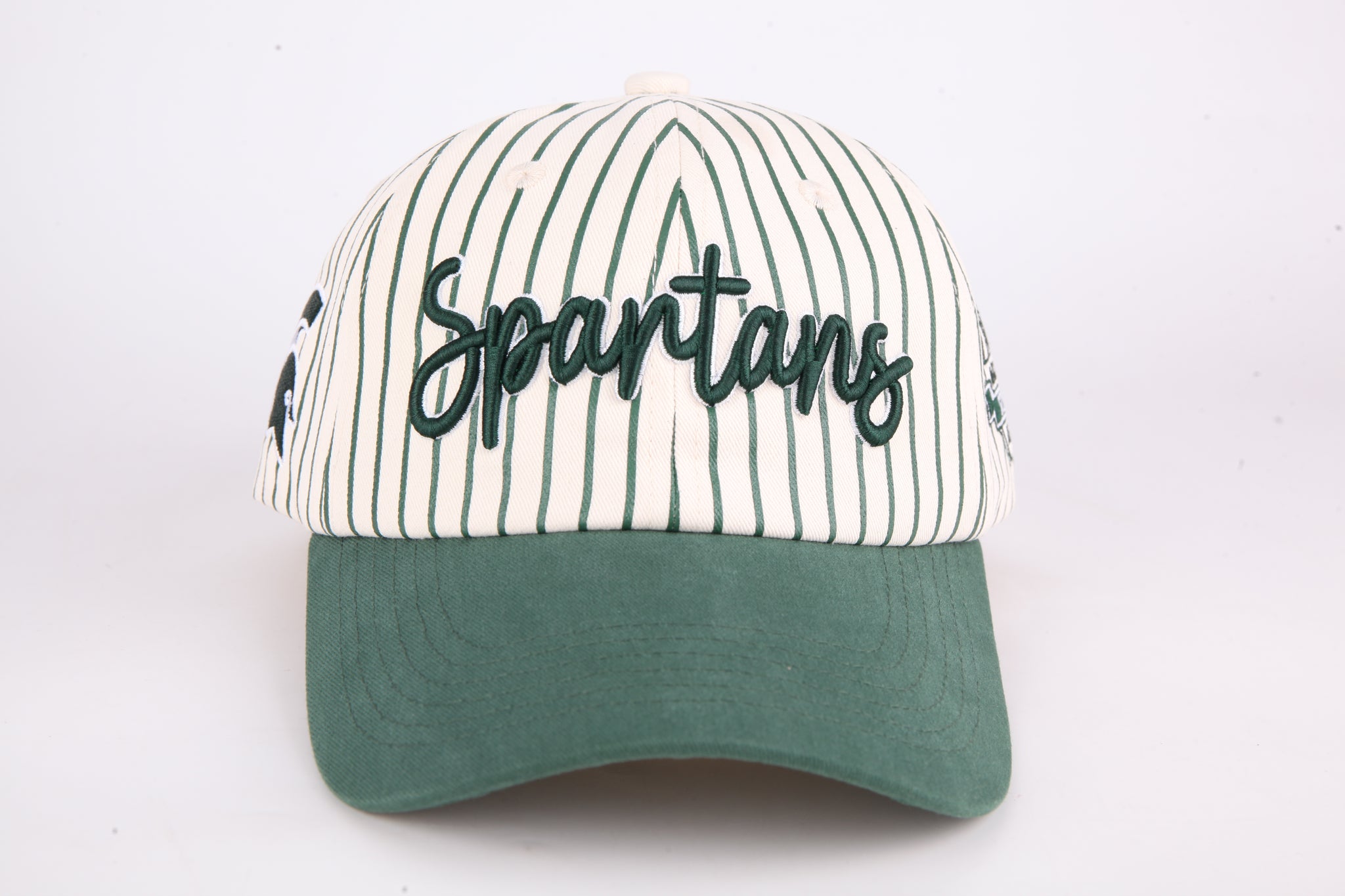 Classic striped baseball cap featuring bold Spartans script embroidery across the front. Structured six-panel design with curved bill and adjustable back closure for a comfortable, secure fit. Perfect for game day or everyday wear. Durable cotton blend construction withstands regular use and washing. Pair it with any casual outfit for instant team spirit and timeless style.